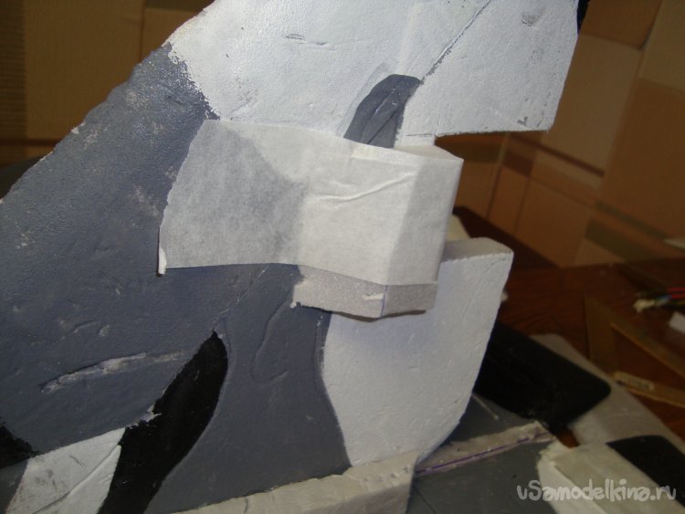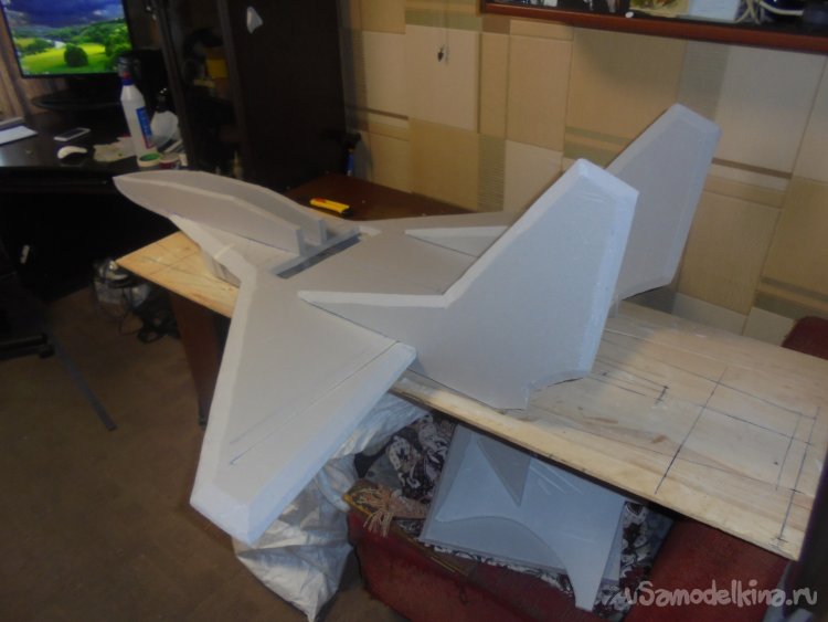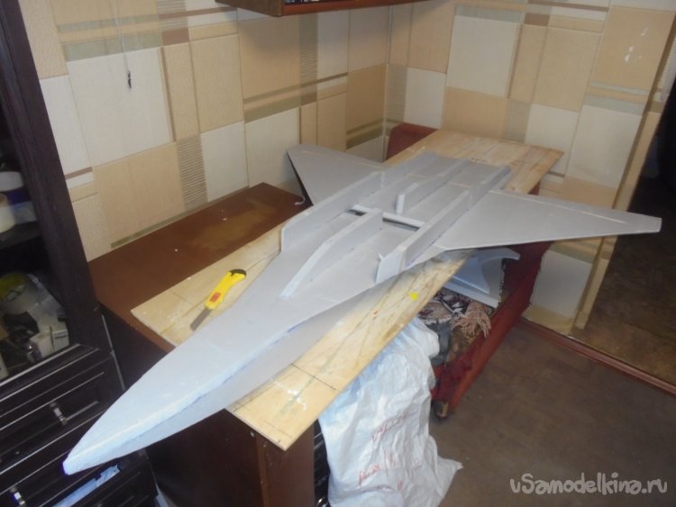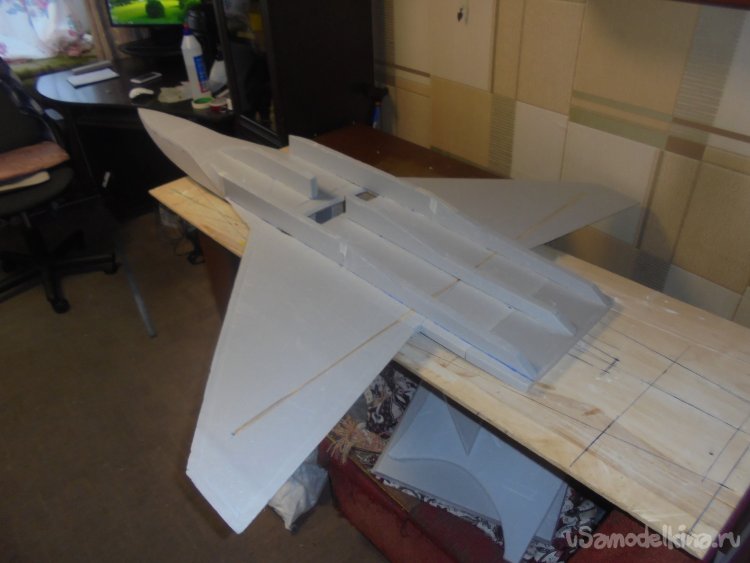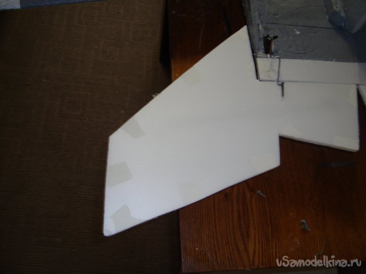 Следом за этим вклеил две полоски из утеплителя, удлиняя фюзеляж до хвостового оперения.
