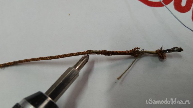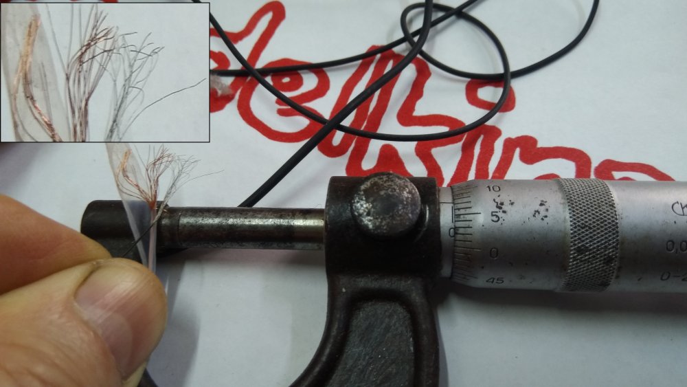 Под увеличительным стеклом видны повреждения и разница в диаметре между новыми проводами и старыми. Новые провода никелированные снаружи, но сопротивлением их можно пренебречь.