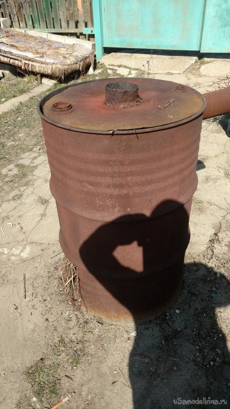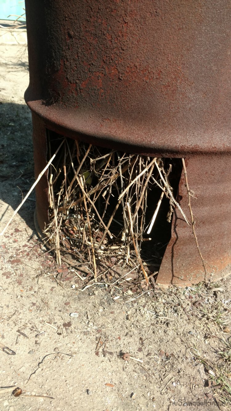 Однажды мне понадобилось спалить, ну очень большую кучу травы и листьев. К тому же это всё было сырое .Подсмотрев у дачников , как они палят листья в бочках то же решил так сделать. Из бочек была старая печка-бубафоня, после небольшой доработки она идеально справилась с перепревшим мусором. Для начала, я вырезал окно внизу бочки.