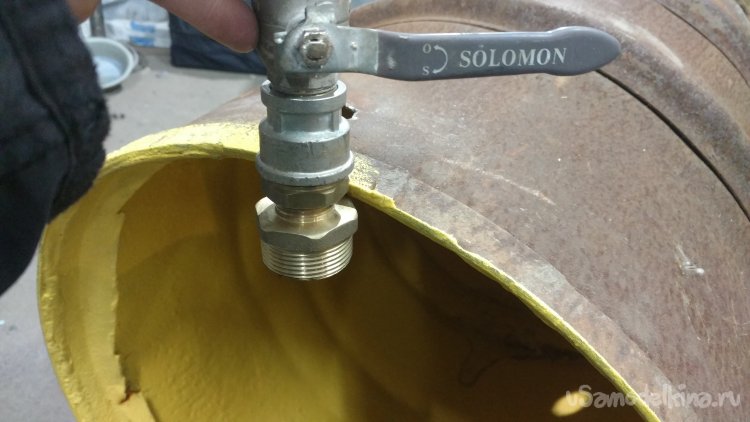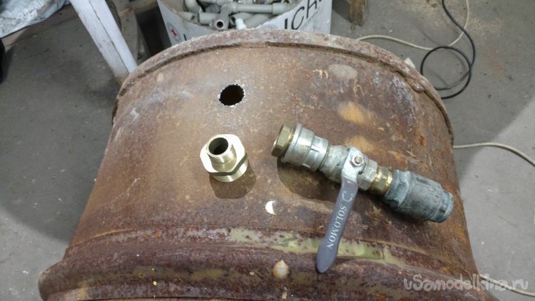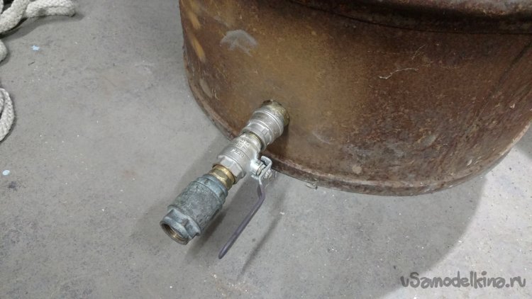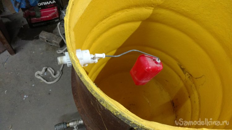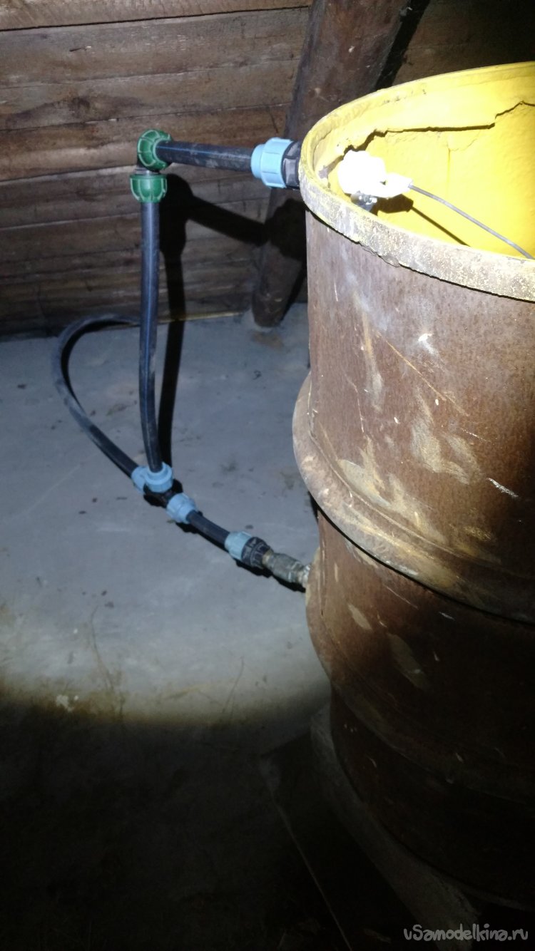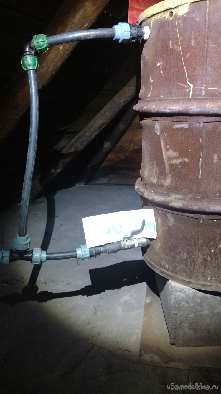 Вода из водопровода набирается в ёмкость, а когда воды нет, наоборот из ёмкости в домашний водопровод. Ёмкость находится на чердаке дома, вода перетекает в водопровод самотёком без насоса, подача и обратка на ёмкость сделана одной одной трубой. И ёмкость можно подсоединить в любое место существующего водопровода. Всё собрано из подручных материалов найденных в гараже. Ёмкость для воды - металлическая бочка на 200 литров, в ней сверлим два отверстия.