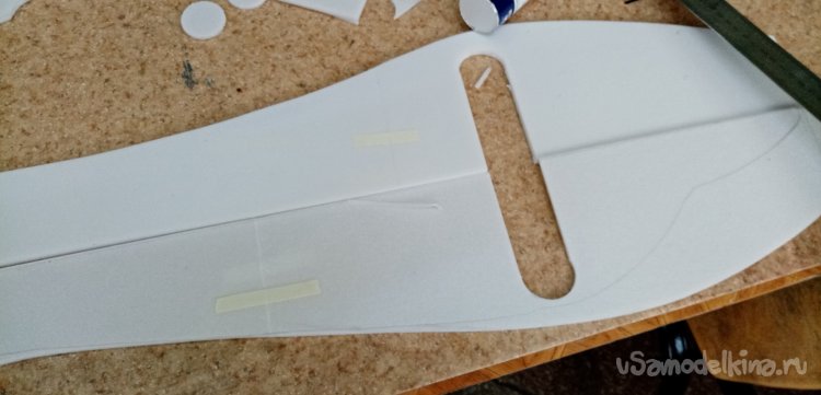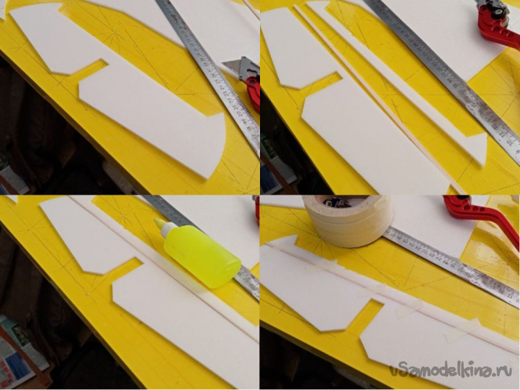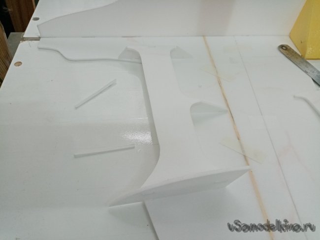 Следующий процесс, изготовлении руля высоты (элеватора). По шаблону размечаю контуры и бодро вырезаю деталь, учитывая, что внешняя, красивая сторона потолочной плитки у меня располагается вверху. Затем разрезаю руль на части. Сначала подвижную часть. Затем стационарную, на половинки. В нее врезаю заранее заготовленную рейку усиления толщиной 2 на 4 мм. Наношу клей и фиксирую половинки малярным скотчем. Склеенную детальку помещаю под пресс.