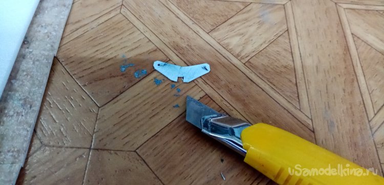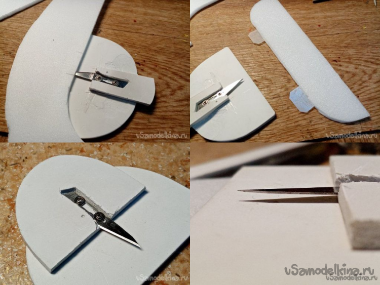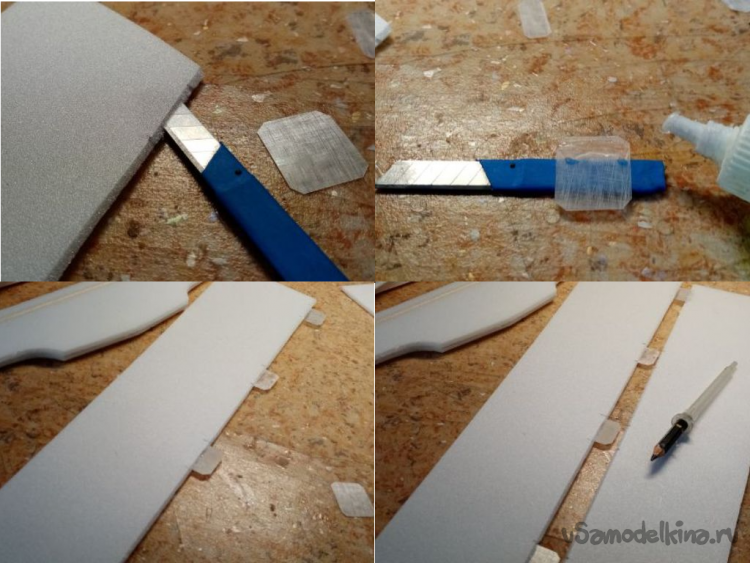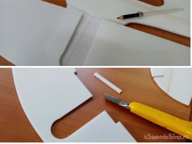 Нужно в детальках прорезать отверстия для заклейки петель, точно посредине толщины. Использую лезвие от маленького канцелярского ножа, заточенное с трех сторон. У меня процедура прорезания точно по средине толщины потолочной плитки, не вызывает проблем. Для юных пилотов изготовил специальный резак, они все равно умудряются резать криво. Таланты.