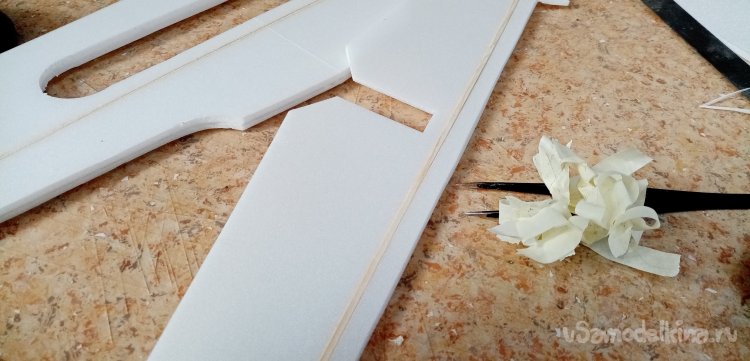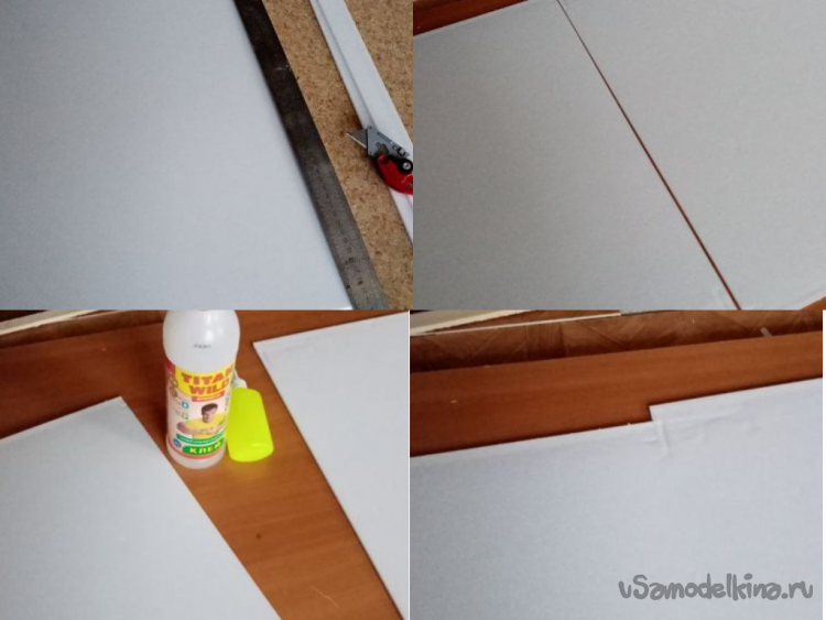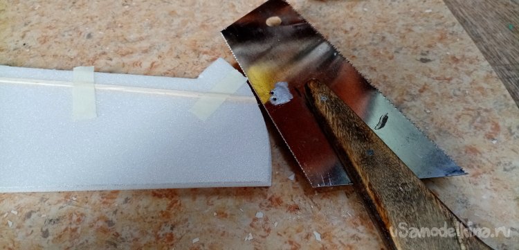 Предварительно готовлю потолочную плитку для фюзеляжа и крыла. Отрезаю жеванный и закругленный край примерно на 4 сантиметра, ширина линейки.