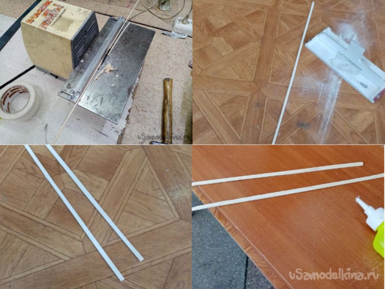 После склеивания заготовок крыла и помещения конструкции под пресс для склеивания, начинаю изготовления усиливающего лонжерона. На станке «умелые руки» отрезаю рейку толщиной в 3 миллиметра и шириной в 8 миллиметров, поскольку у меня крыло из двойной поточной плитки по 4 миллиметра каждый, получается 8.