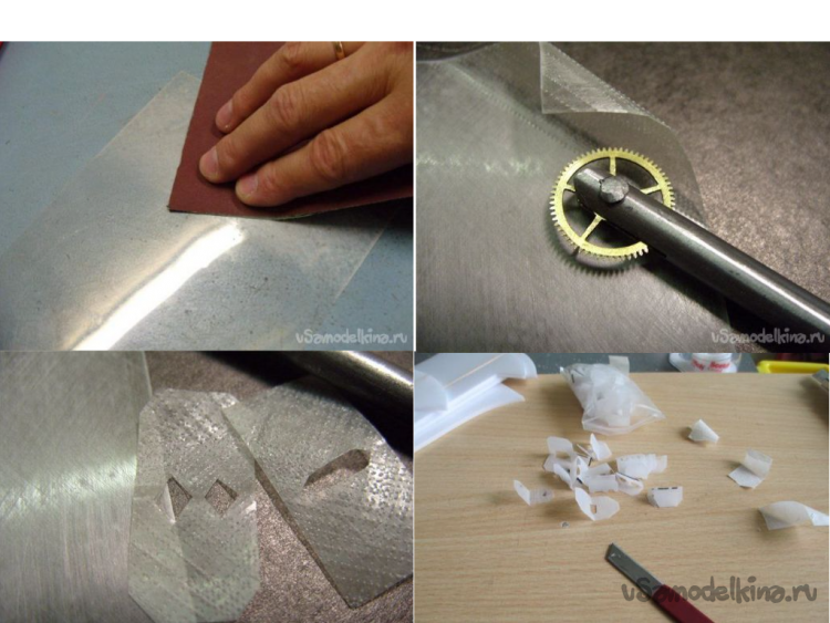 Такую же процедуру проделываю с подвижным элементом руля высоты. Нужно изготовить некоторое количество навесных петель. В качестве основного материала использую защитную пленку от экранов ноутбуков. Она устанавливается при транспортировке. Для повышения адгезии при склеивании, применяю парочку «патентованных» приемов. Первый, шкурю крупной шкуркой с двух сторон. Затем полученную заготовку прокатываю «спец колесиком» изготовленным из часовой шестеренки и большого гвоздя, в качестве ручки. Это действие тоже в двух сторон. Получается перфорированная поверхность. Которая обеспечивает отличное сцепление при склейке.