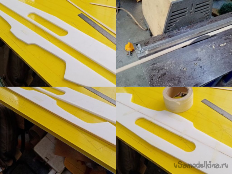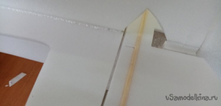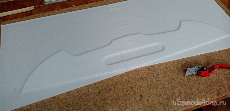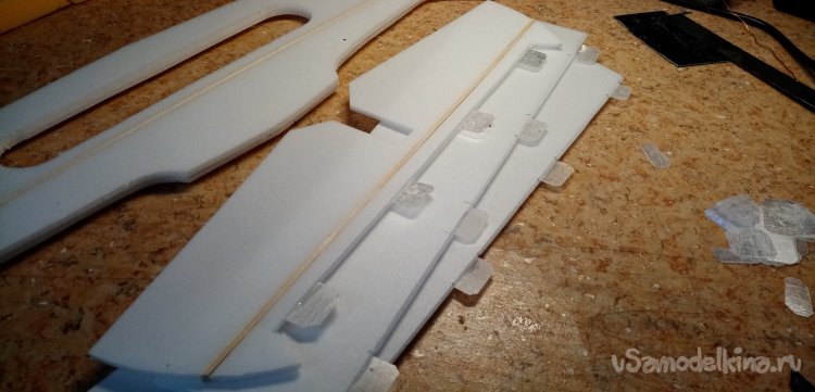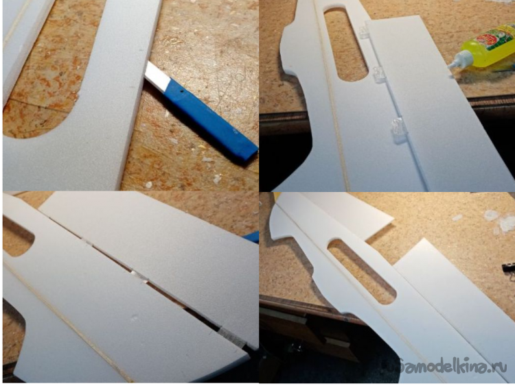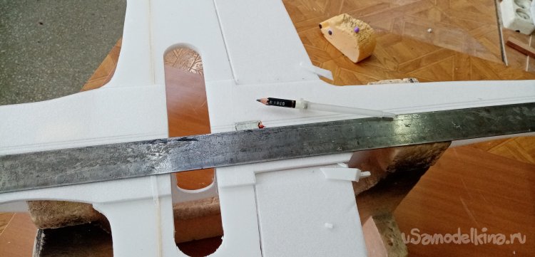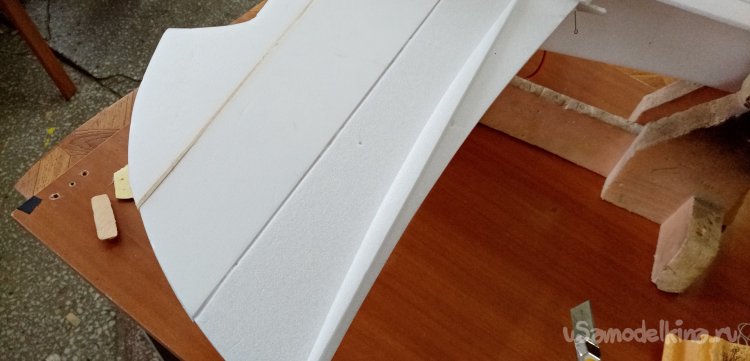 Немного шкуринга для гладкости и можно извлекать крыло из «пресса». Клей немного схватился и можно продолжать. По разметке просто разрезаю крыло повдоль. Раньше практиковал врезание её в крыло, но не задалось, трудно прорезать в двойном пенопласте четкое отверстие в 3 миллиметра, да еще сдобренное клеем. В этом случае края остаются без усиления.