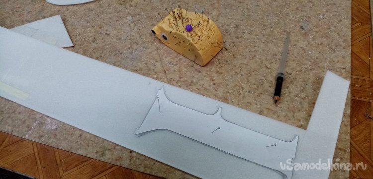 Наконец все подоспело, начинаю изготовление крыла. Поскольку опять у меня уличный вариант самолетика крыло будет из двух слоев потолочки и нижняя часть фюзеляжа тоже. Размещаю шаблон на поверхности и обвожу при помощи мягкого карандаша 8В.