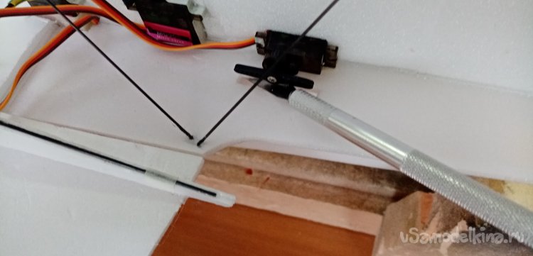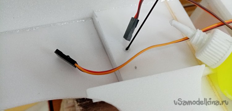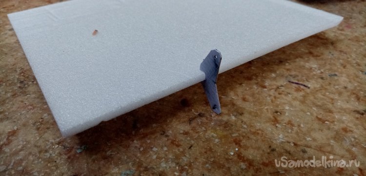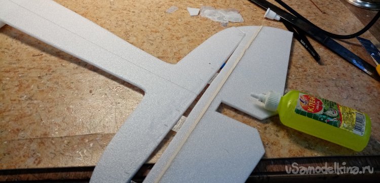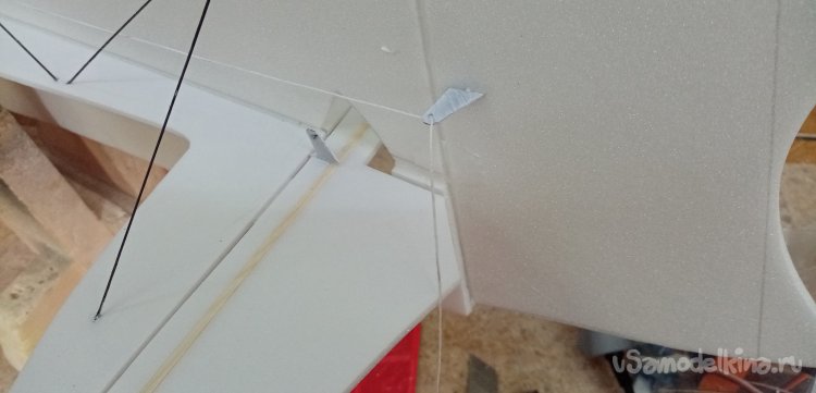 После укрепления петель в рулевых поверхностях нужно установить. Размечаю места расположения петель и по ней прорезаю отверстия в торце пенопласта. Затем наношу клей на кончики петель и с краю наискосок начинаю монтаж руля высоты.