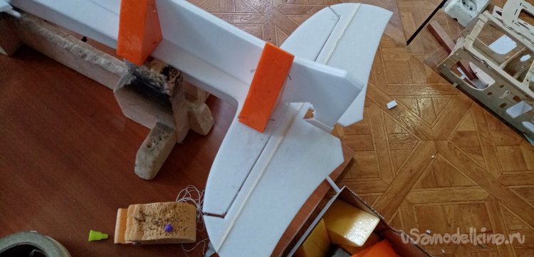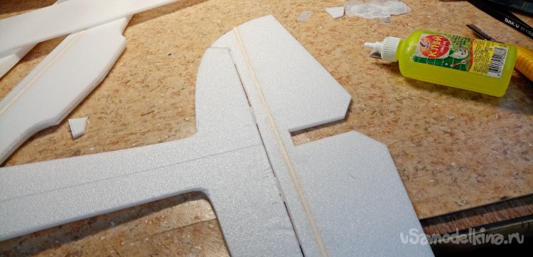 После навески и приклейки элементов управления склеиваю крыло и горизонтальную часть фюзеляжа с рулем высоты.