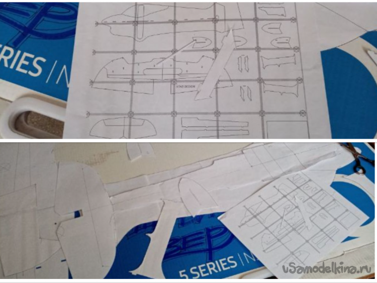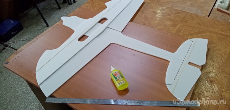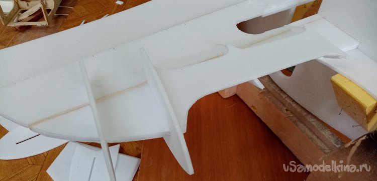 За это время клей достаточно хорошо фиксирует конструкцию и можно работать дальше. Полостью он высыхает за сутки примерно. Заготовил три попарных листа потолочной плитки, на крыло и фюзеляж.