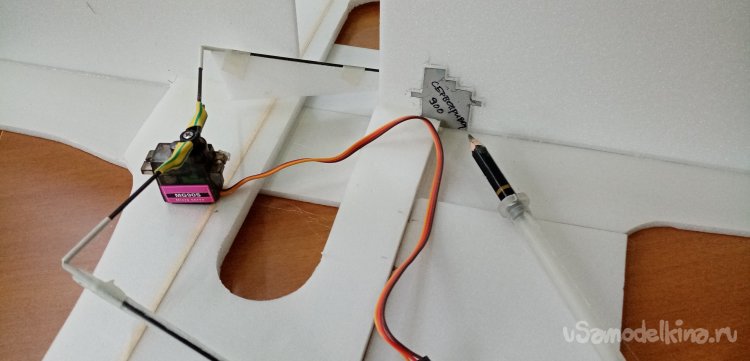 Привязываю кончик нитки на качалку сервопривода, затем продеваю в отверстие кабанчика, протягиваю. На другую сторону, в следующее отверстие и затем закрепляю на второй конец качалки сервопривода. Получатся протяжка по кругу. Устанавливаю рули в нулевое положение и фиксирую нитку в отверстиях циакрином.