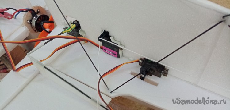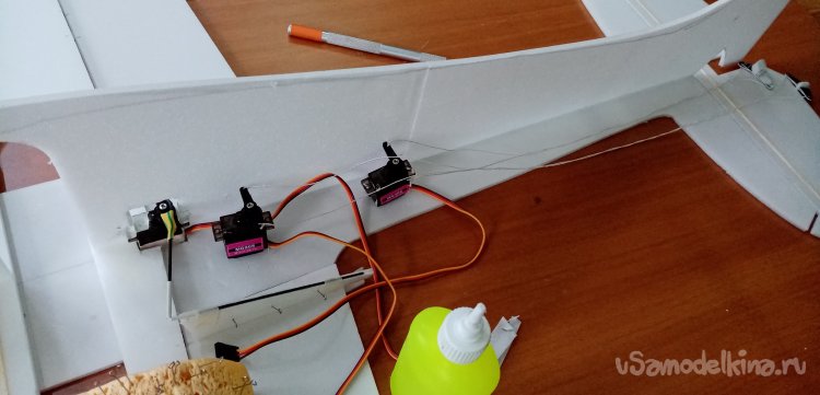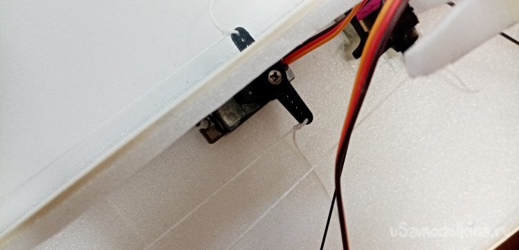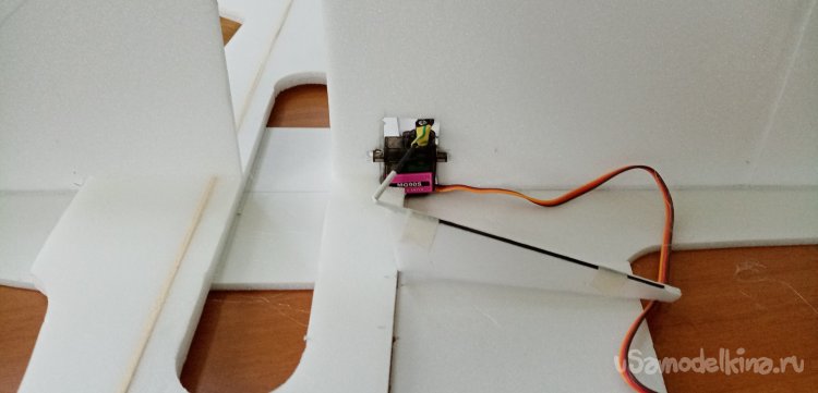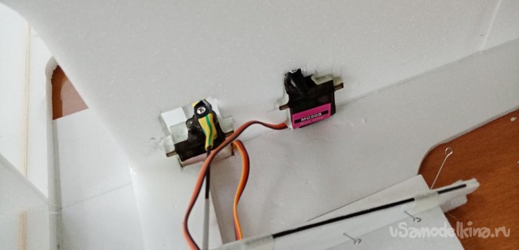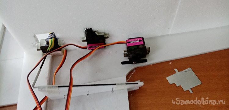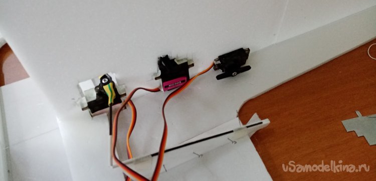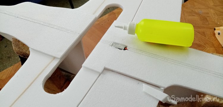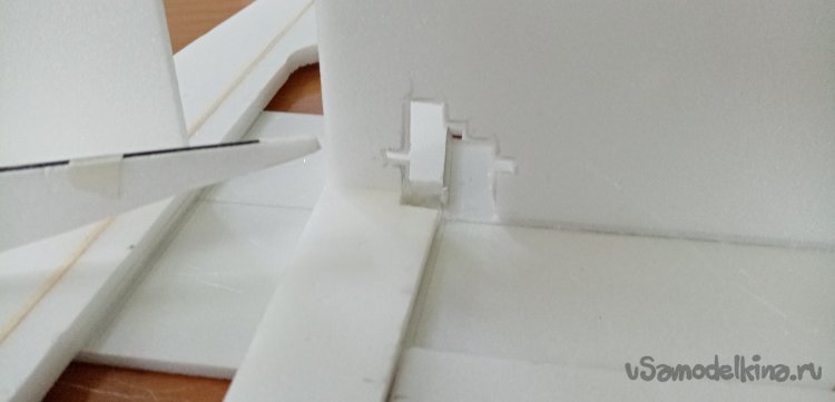 Извлекаю разбитый самолетик из укромного уголка, промеряю все места и размеры установленного ранее оборудования. Проекты одинаковые и переделывать не нужно. Не лень это, здравый рационализм. При помощи шаблона размечаю место установки сервопривода элеронов. С некоторым запасом внутрь прорезаю скальпелем отверстие и примеряю сервопривод по месту.