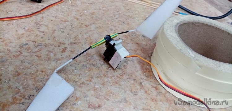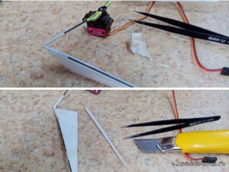 Ориентируясь на измерения со сломанного самолетика, переношу размеры установки сервоприводов на руль высоты (элеватор) и руль направления (рудер). По шаблону размечаю отверстия и прорезаю скальпелем. Примеряю, сервоприводы к местам установки, оклеиваю малярным скотчем для защиты от клея. При установке на другую модель, просто снимаю скотч с клеем и сервопривод как новый.