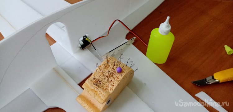 Оборачиваю сервопривод малярным скотчем, защита от клея. Вклеиваю на место. Кабанчики на элероны подошли, не зря все размеры снял. Приклеиваю на титан предварительно выждав запустевания клея минут 5. Закрепляю иголками. Втыкая наискосок, стараюсь не попасть в клей.
