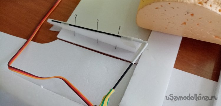 Затем выкраиваю элероны и отрезаю прилегающий к крылу край под 45 градусов с двух сторон. При навешивании на петли элемент будет свободно перемещаться вверх и вниз.