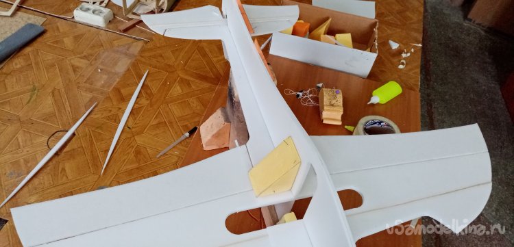 Пока сохнет фюзеляж, монтирую предкрылки. Детали давно порезаны из остатков потолочной плитки и ждут своего часа.