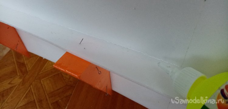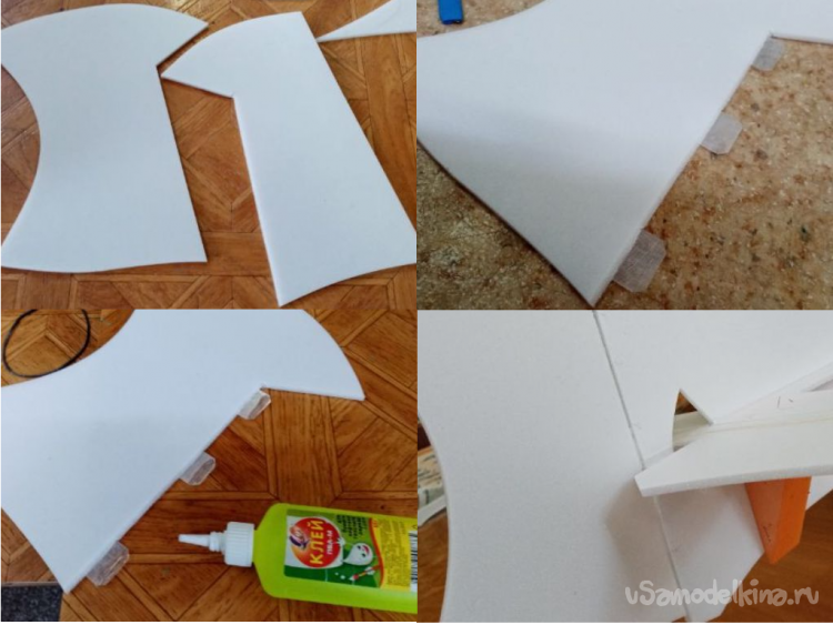 Нужно закрепить деталь строго вертикально. Есть треугольники, вырезанные из пеноплекса ровно в 90 градусов, оклеены скотчем для защиты от прилипания клея. Закрепляю элементы иголками с ушками.
