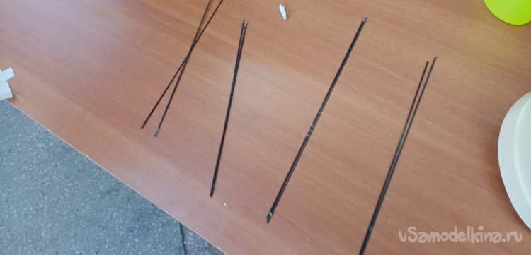 Пока клей сохнет, качалки приклеиваются, продолжаю работы. Элементы усиления из угольного прутика диаметром в 1.5 миллиметра, снятые с разбитого самолетика очищаю от клея.