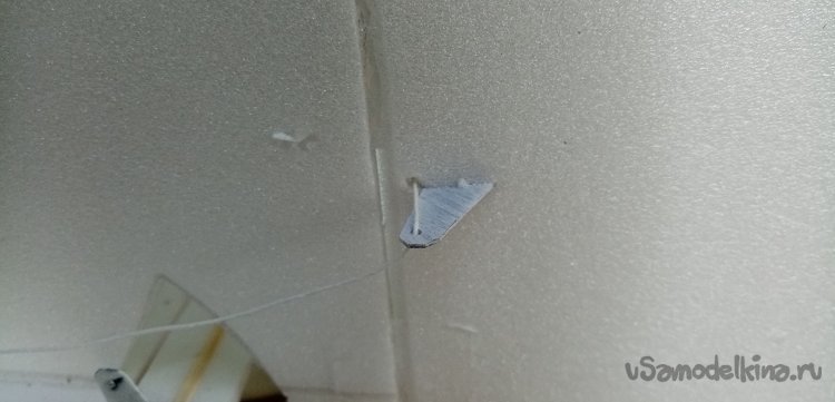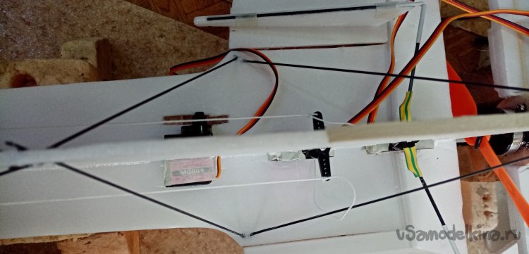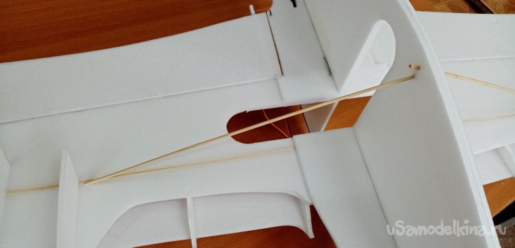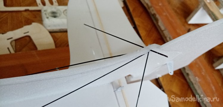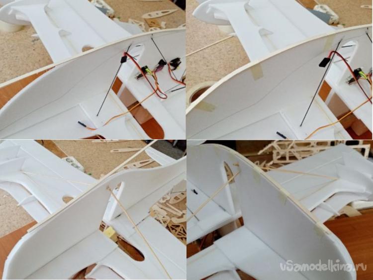 Окончательно застыл клей, можно начинать проводку управления на хвостик. Сначала снимаю весь фиксирующий скотч. Приготовил толстые нитки.