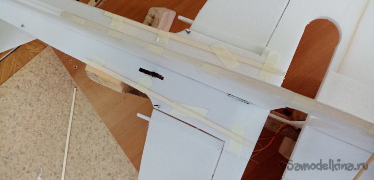 Монтирую усиление крыльев из бамбуковых шпажек. Затем напиливаю заготовок на усиление краев фюзеляжа. Размером 1х4 миллиметра. Нужно усилить носовую часть фюзеляжа по контуру, поскольку имеются довольно большие вырезы под мотор и винт. После пилинга небольшой шкуринг и можно приклеивать на место. Наношу клей, выдерживаю и фиксирую палочки малярным скотчем.