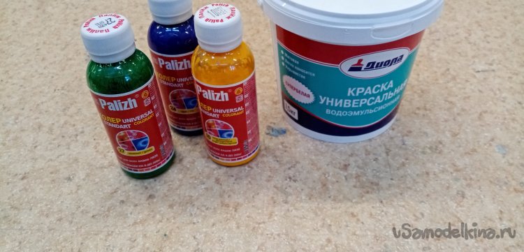 Закуплена водоэмульсионная для стен белого цвета и тонеры. Покупка обошлась в 250 рублей. Хорошо сэкономил. Банка художественного акрила в 50 грамм стоит те же деньги. А тут целых полтора кило чисто белого веса, плюс несколько тонеров. Замешал в баночках нужный оттенок синего и голубого.