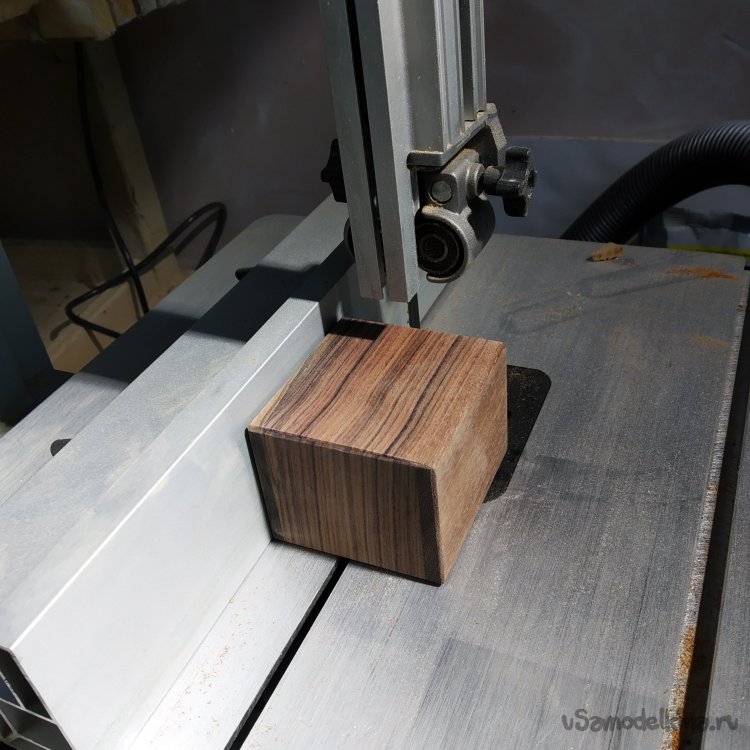 Теперь наш шлифованный кирпич нужно привести в состояние шкатулки, а именно – распилить. Я, конечно, мог бы сделать это ручной ножовкой, но при наличии ленточнопильного станка с направляющей, как-то не хочется напрягаться. Хотя полотно тупое и косит во все стороны. Но не сильно.