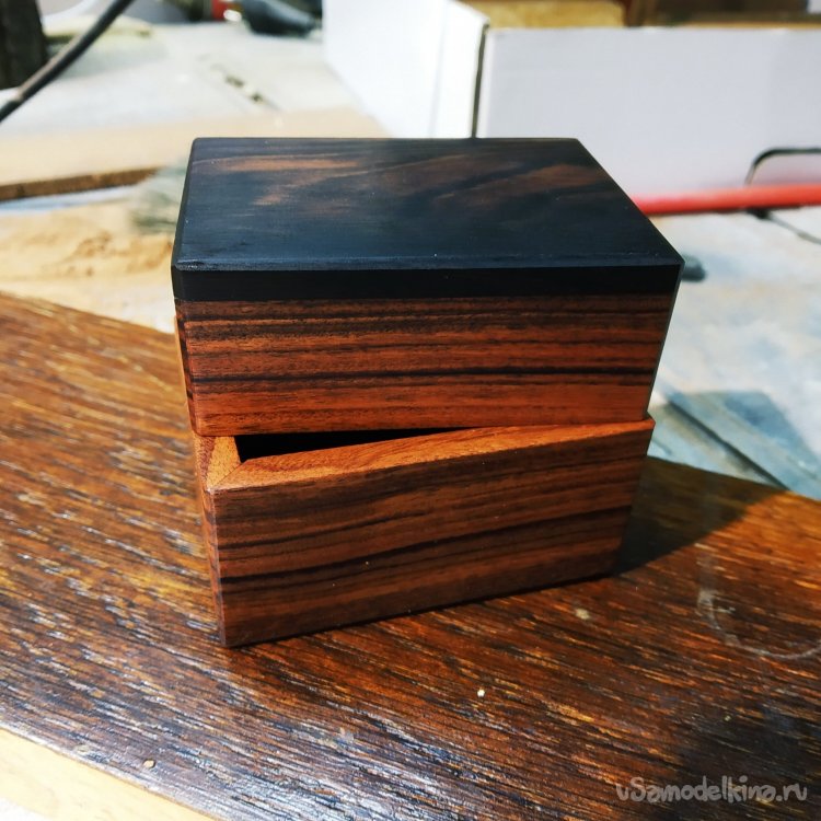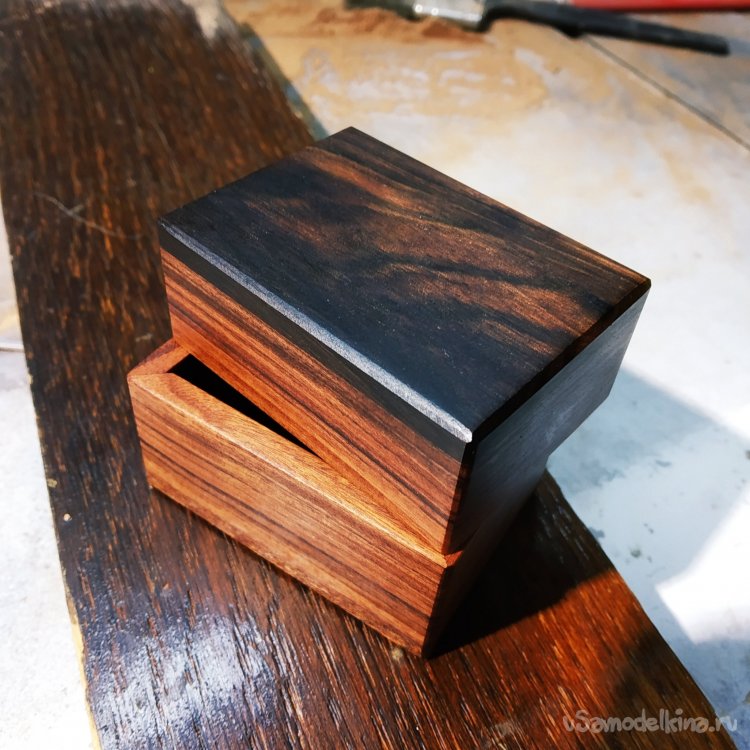 Изначально я хотел сделать шкатулку чисто из палисандра, но потом решил добавить элемент эбена, а потом и сапеле, недорогой породы, чтобы сэкономить палисандр и эбен.