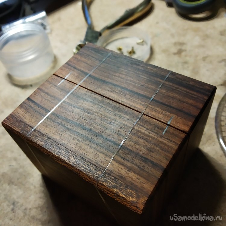 Значит, по прибытии домой я стянул резинками две половинки шкатулки, чтобы не прокосить разметку петель. А они должны быть поставлены очень точно, иначе шкатулку может перекосить, и она не будет закрываться до конца.