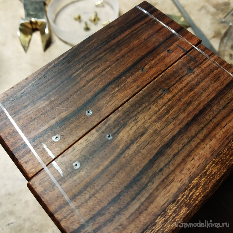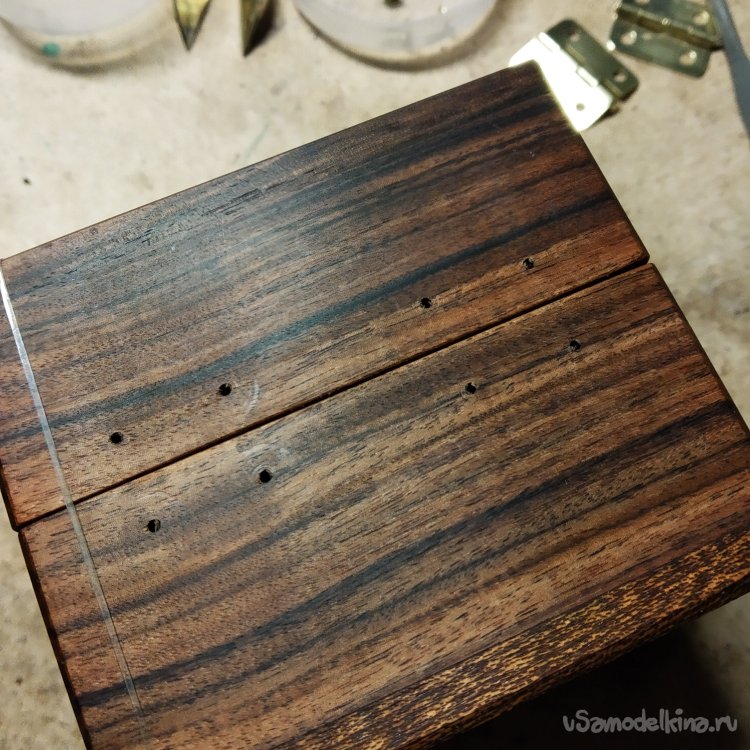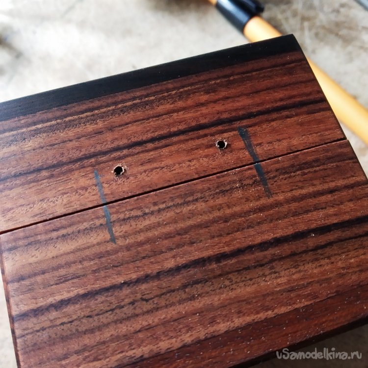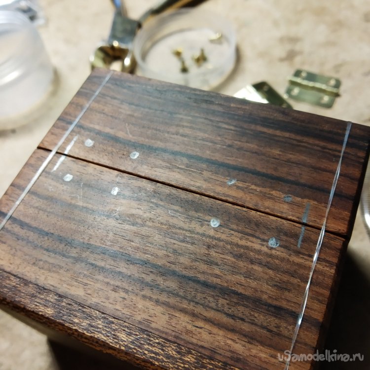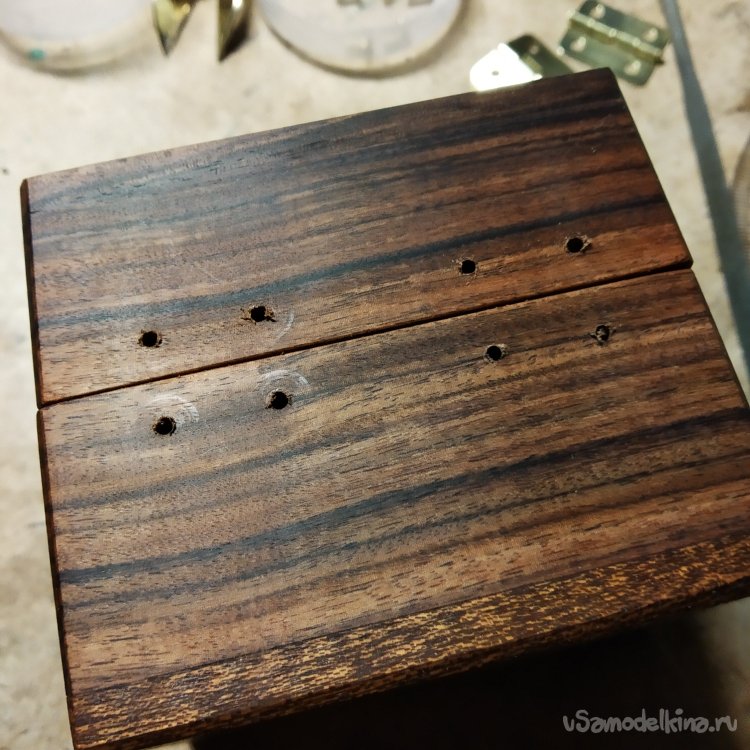 Далее я накернил отверстия острым надфилем, чтобы сверло не увело никуда, а то придется перешлифовывать и перефинишировать всю стенку шкатулки.