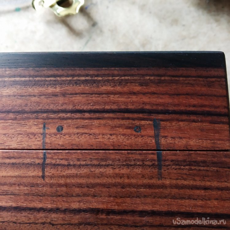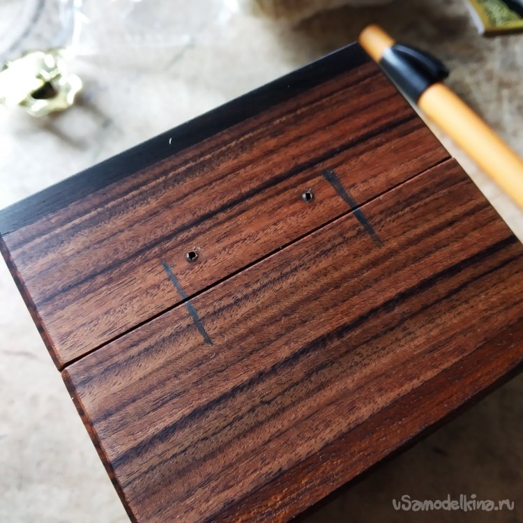 Прикладываю верхнюю часть замка и отмечаю отверстия. Замок также нужно ставить параллельно граням шкатулки.