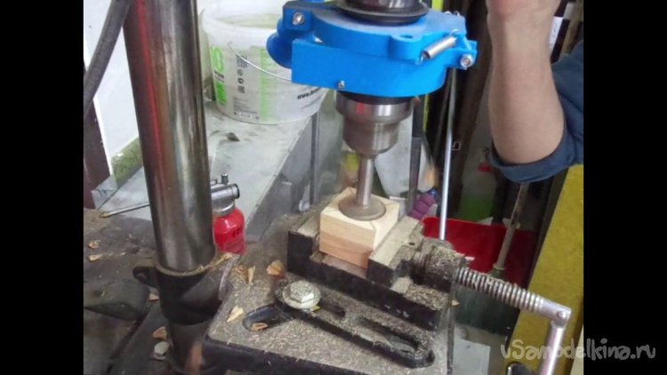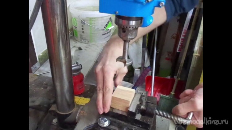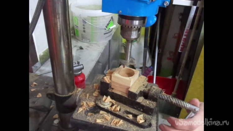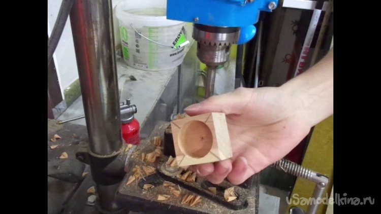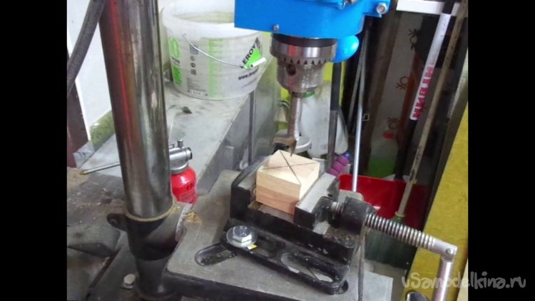 Затем я запихнул кубик в сверлильный станок, предварительно потратив минут 20 на его настройку и включение. Но в видео это 10 секунд. Ну и, конечно же, разметил брусок, чтобы просверлить точно не по центру.