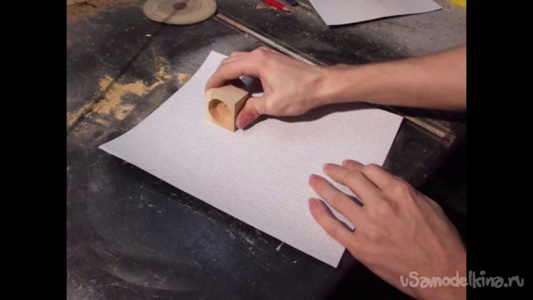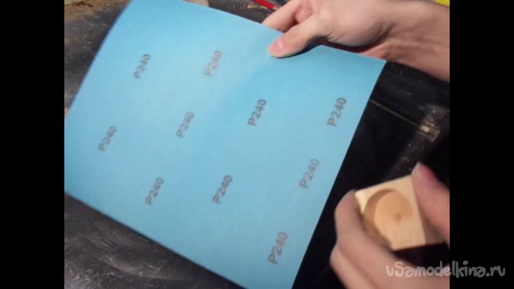 Далее я оторвал кусок каждого наждака, чтобы расшлифовать немного отверстие для свечки, потому что при сверлении дерева 35мм превращается в 34мм. А свечка 35,5мм.