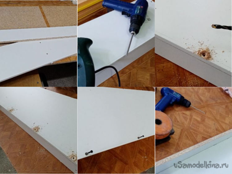 И так нашлись достаточно длинные мебельные панели белого цвета, длиной в пару метров. Изготовление углового стапеля не заняло слишком много времени. Сверлим в краю плиты отверстия, для шурупов отступив от края 8 миллиметров. В верхней панели сверло большего диаметра, в нижней меньшего, зенкую под шляпки шурупов по дереву. Собираю конструкцию в кучу.