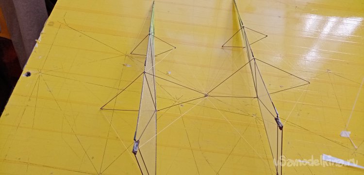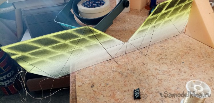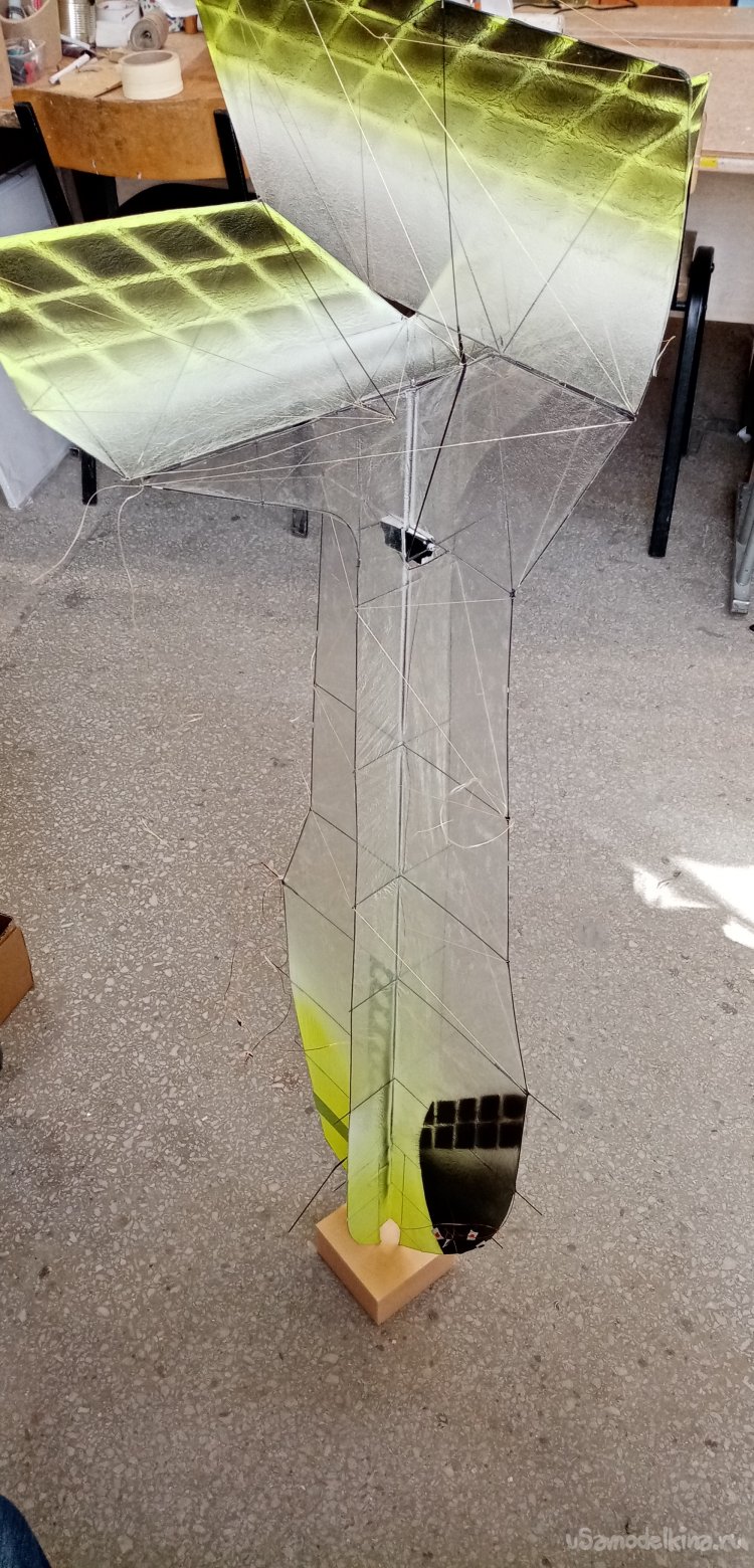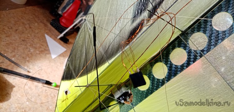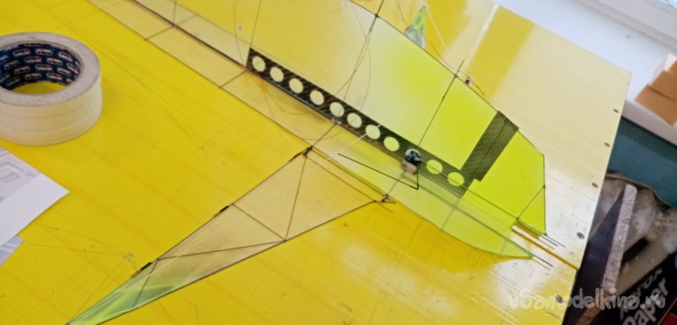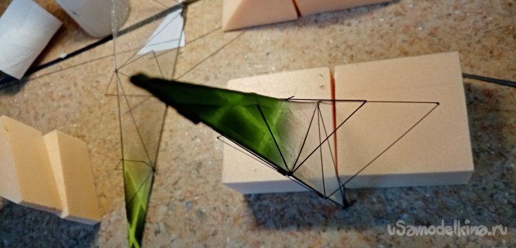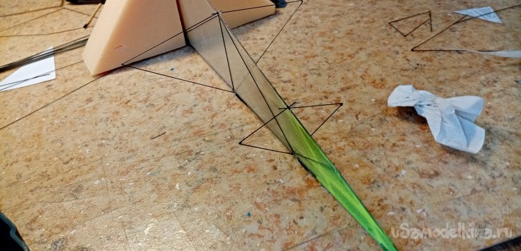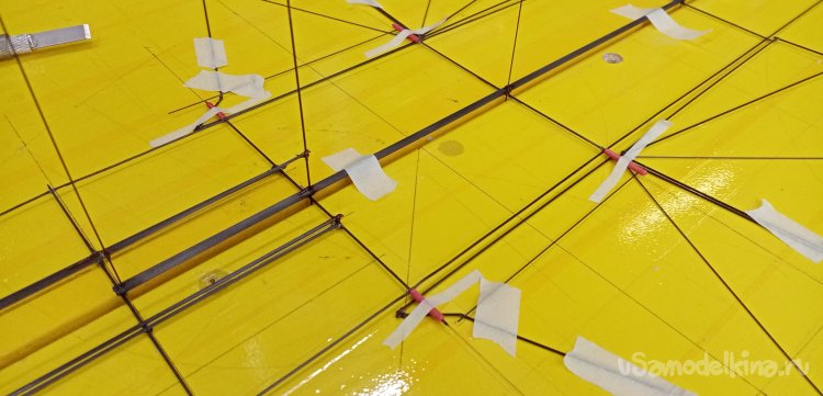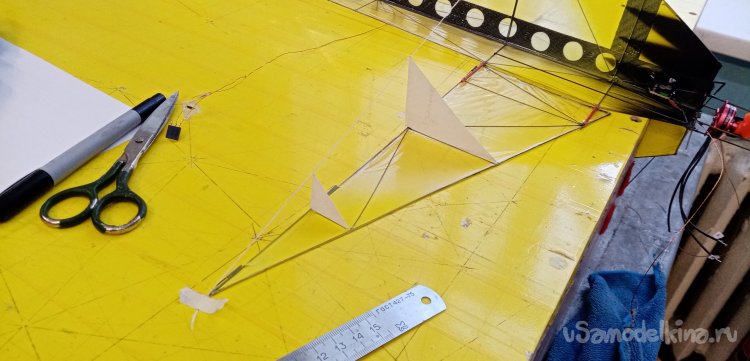 Конструкцию фюзеляжа растягиваю лишь частично в самых ответственных местах иначе трудно размещать и устанавливать оборудование, через сплетение ниточек и прутиков.