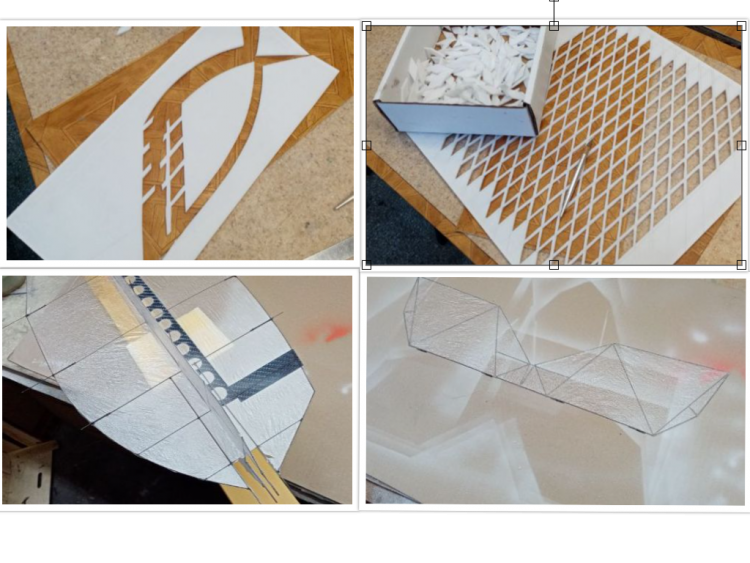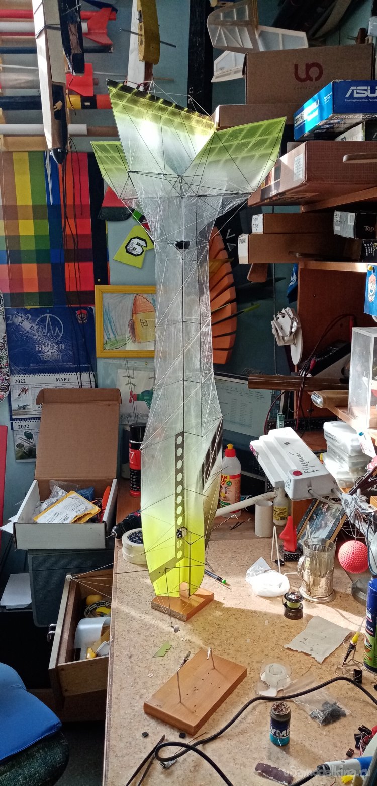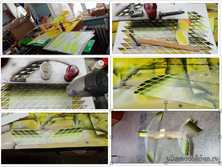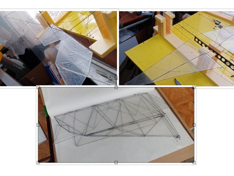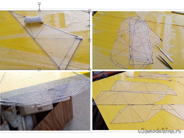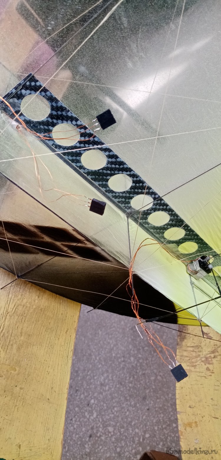 Конструкцию фюзеляжа растягиваю лишь частично в самых ответственных местах иначе трудно размещать и устанавливать оборудование, через сплетение ниточек и прутиков.