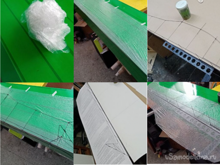 Следующий этап, оклейка фюзеляжа мятой пленкой не удался. Сама процедура достаточно проста. Со стенда снимается одна половинка столешницы. Пленка закрепляется на горизонтальной и вертикальной поверхностях. На половину вертикального набора и горизонтального фюзеляжа наносится клей и конструкция прикладывается к пленке. В результате этой операции получаем обтяжку половины фюзеляжа. Но поскольку на горизонтальный набор приклеил прутик сверху, образовался уступ и пленка к прутику не приклеилась. Первая и вторая попытки не удались. Пришлось снимать пленку и смывать клей с набора.