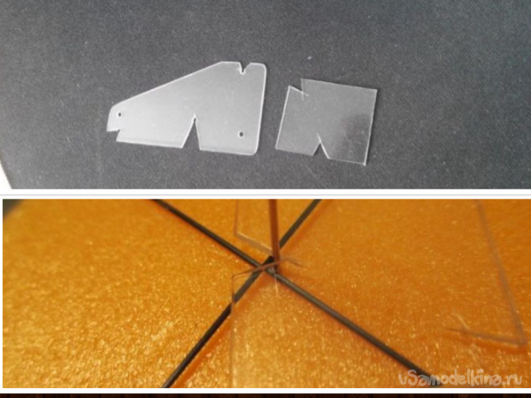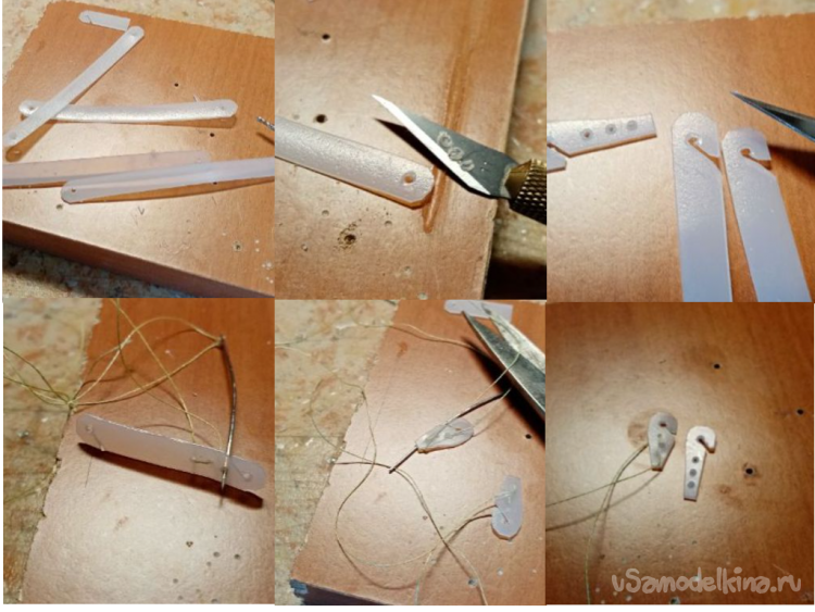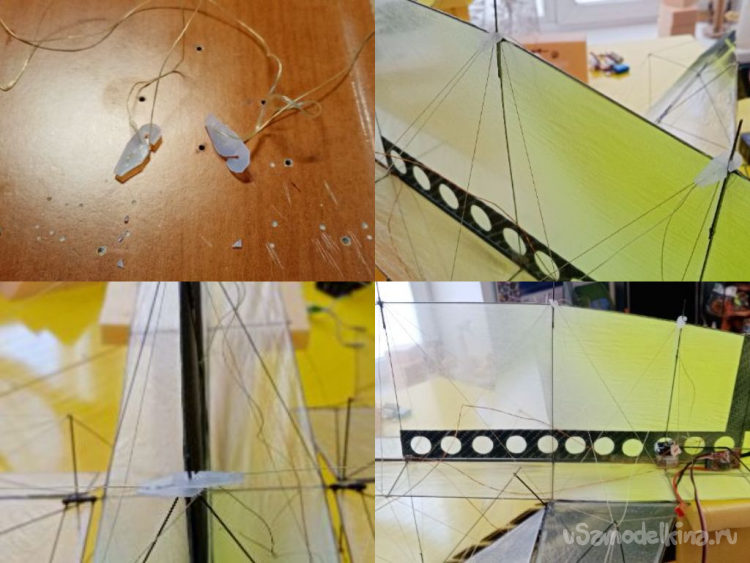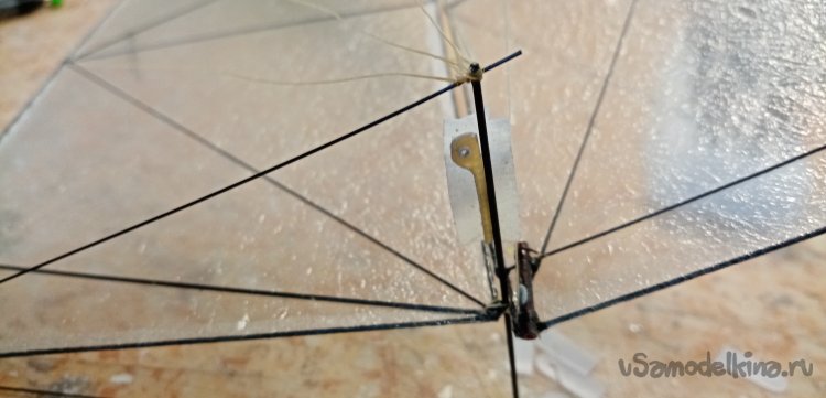 Элементы крепежа крыльев изготовил из подходящего пластика. Сами растяжки исполняю из рыболовной плетенки.