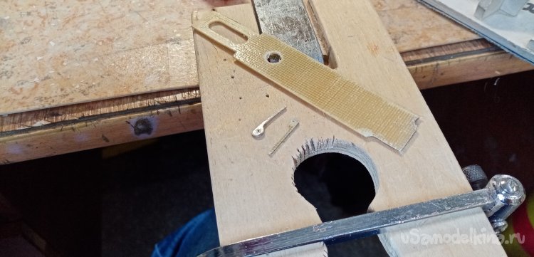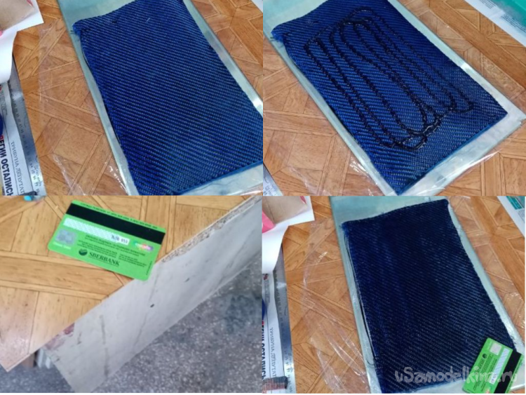 Приготовил парочку толстых стекол, которые покрыл разделительной ваксой на два слоя. Одолели сомнения, может прилипнуть смола, сверху положил еще пленку. На нее вырезанную роликовым ножом заготовку из углеткани. Полил разведенной эпоксидной смолой равным количеством по весу ткани. Разровнял связующее при помощи пластиковой карты, накрыл пленкой, сверху стекло и под пресс. Из заготовки вырезал полосу нужного размера. Отверстия усиления пробил при помощи заточенной металлической трубки на торце березовой бакулки.