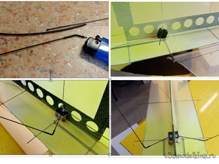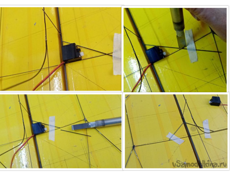 На элероны нужно укрепить качалки управления и элементы соединения с тягами от сервоприводов. При помощи угольников и скотча закрепляю прутик в 1 миллиметр и приклеиваю циакрином с активатором. Приматываю арамидной ниткой.