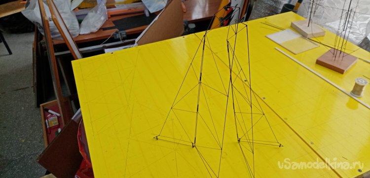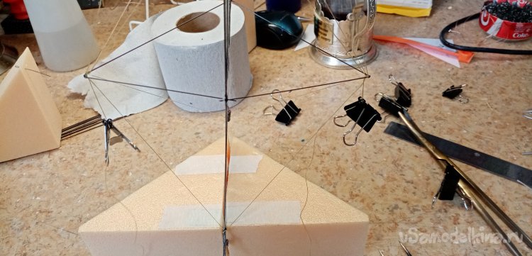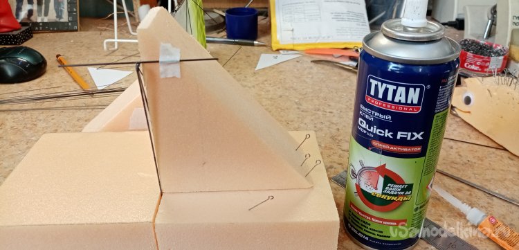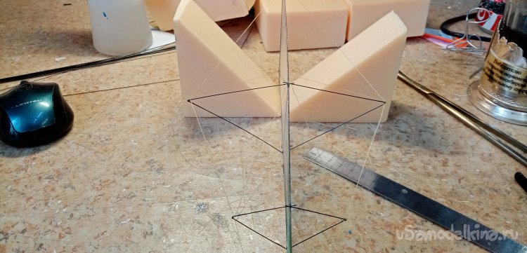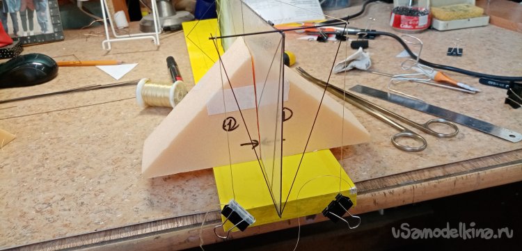 Начинаю устанавливать усиления конструкции и растяжки. Для работы с фюзеляжем изготовил простейшие стенды. Один из полосок пенопласта, второй из отрезка мебельного щита. На него конструкция будет устанавливаться вертикально на миллиметровые прутики моторамы. Наклеиваю кусочки пластилина и вдавливаю прутики, затем сверлю отверстие на 1.5 мм. Установив фюзеляж в вертикальном положении, приклеиваю растяжки на фюзеляж, укрепляя конструкцию на кручение и изгиб. Они выполнены из арамидной нити и приклеены каркасу циакрином. Операция очень ответственная, при малейшем натяжении не в ту сторону тонкие прутики изгибаются и конструкция перекашивается.