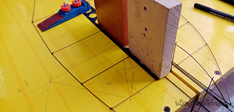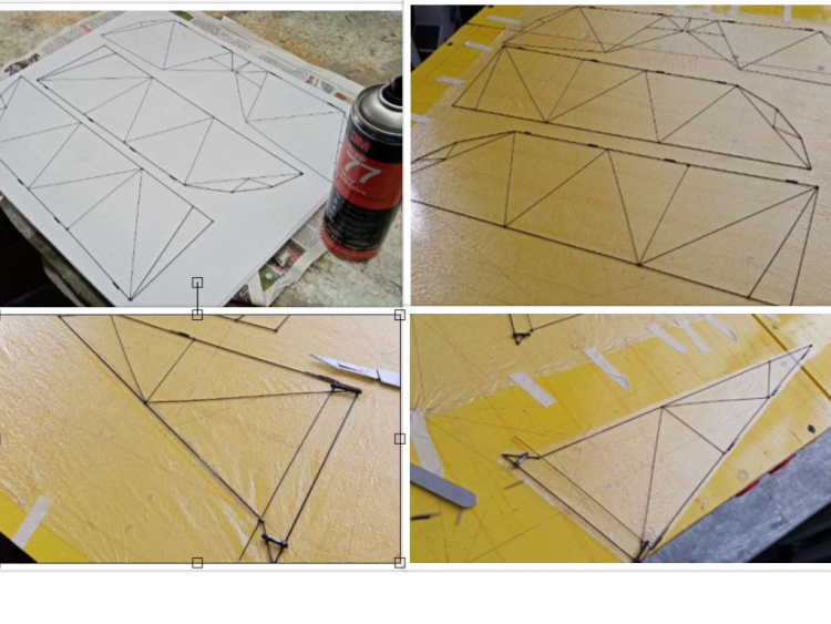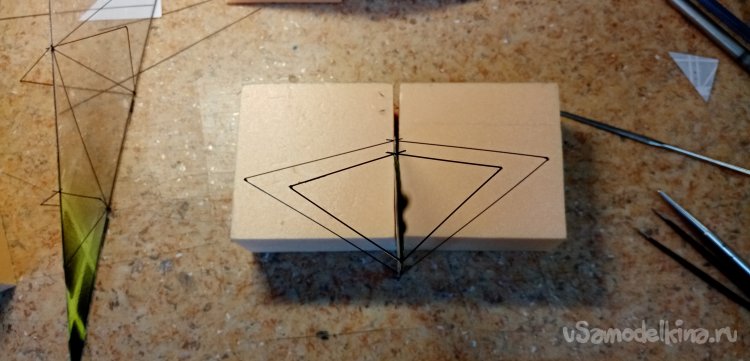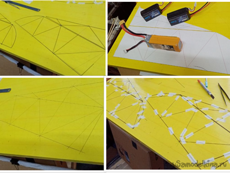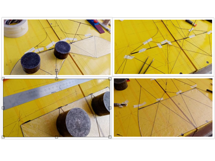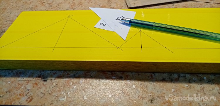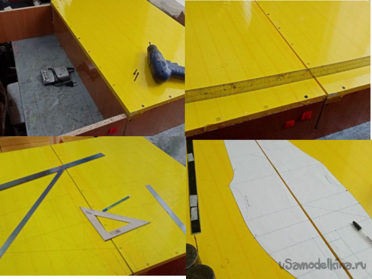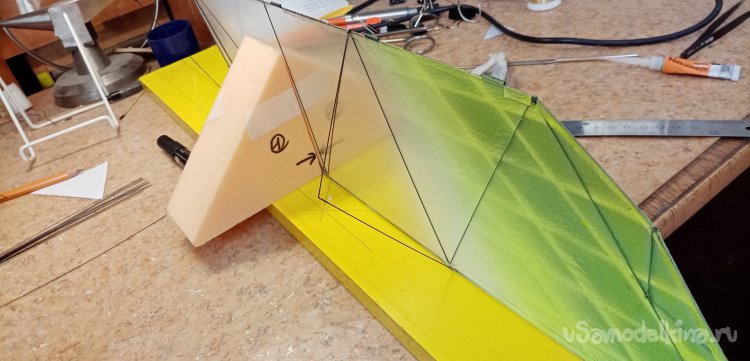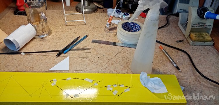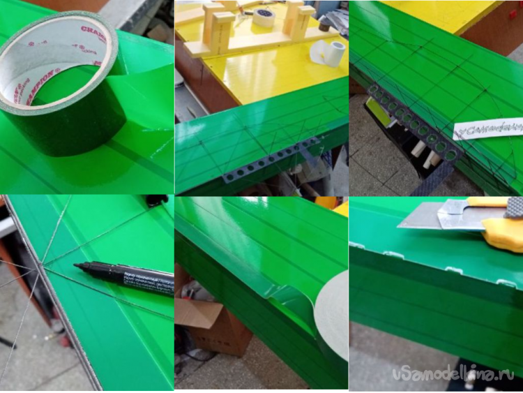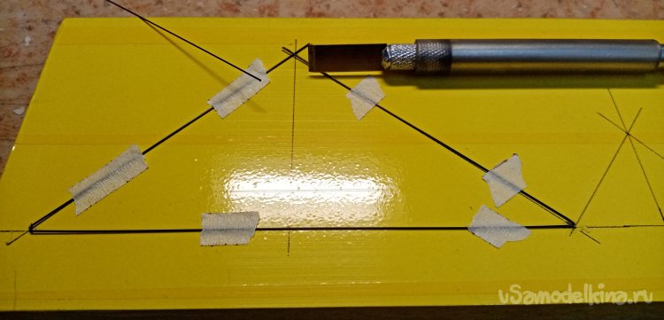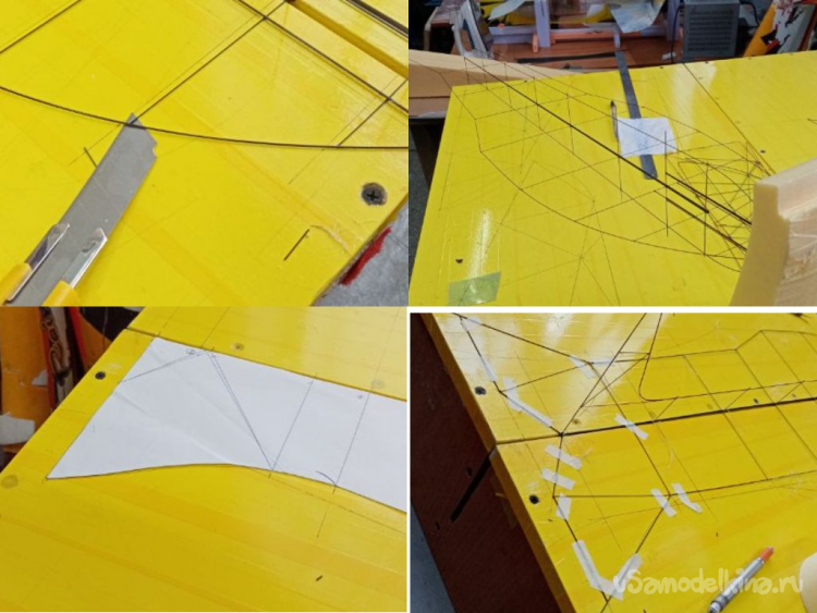 Ориентируясь на шаблоны, расчерчиваю на стапеле, оклеенном скотчем будущие элементы усиления.