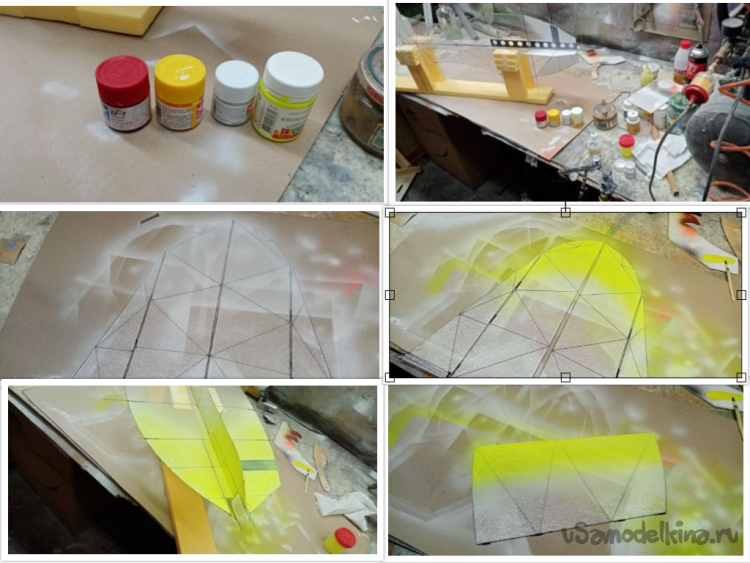 В бой вступает краска ТАМИЯ для стендовых моделей. Немного разбавляю фирменной жидкостью для первого слоя, чтобы лучше зацепился. Модельная краска, очень хорошо ложится на пленку и не отлетает при длительной эксплуатации. Для увеличения яркости краски использую первым слоем белую, как подложку. Затем наношу желтую. Все наносится на три слоя с промежуточной сушкой феном для волос.