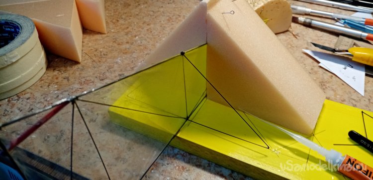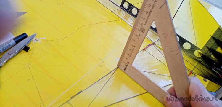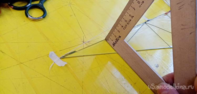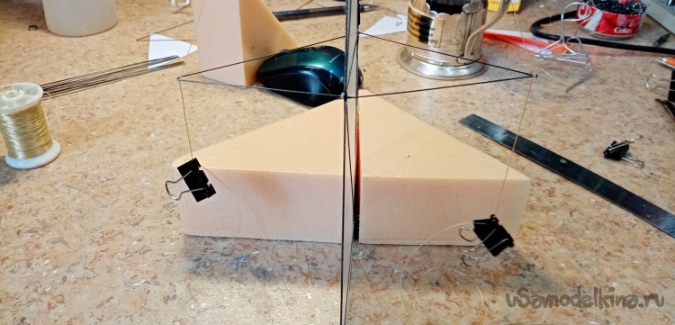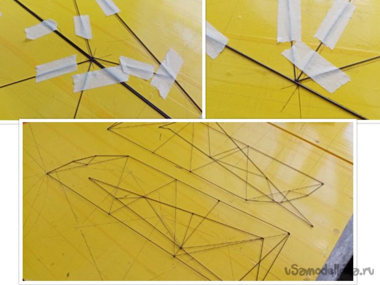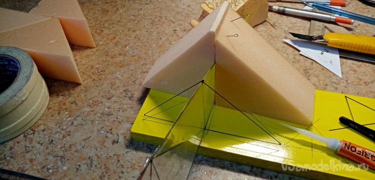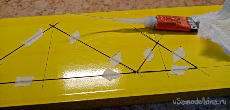 Возникла проблема. Стапель короче конструкции фюзеляж на 10 сантиметров. Вычерчиваю хвостовую часть на краю плиты. Сдвигаю весь фюзеляж вперед на эти несчастные 10 сантиметров и продолжаю. После завершения склейки каркаса провязываю стыки арамидной нитью и проливаю циакрином.