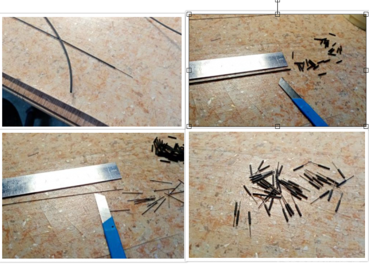 Начинаю установку петель. Для удобства сборки крыла и элерона на петлях прутики шарнира подрезаю по убывающей длине. Первый длиной в 12 мм, второй в 11, третий в 10, четвертый в 9 и так далее. Это значительно облегчает процесс навешивания. Раскладываю на стапеле крыло и элерон, фиксирую малярным скотчем. Между ними помещаю собранные шарнирчики по прядку от самого длинного к самому короткому. Приклеиваю тоже по порядку, к крылу элементы с прутиками, к элерону трубочки. Процедура просто микронная. Можно все склеить в кучу. В этой ситуации сильно помогают тонкие трубочки для циакрина, купленные на АЛИ ЭКСПРЕССЕ. Трубочка отлично подходит для носика клея. Он практически не застывает в ней. Очень выручили китайцы в этой ситуации.