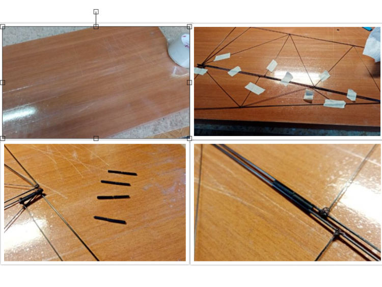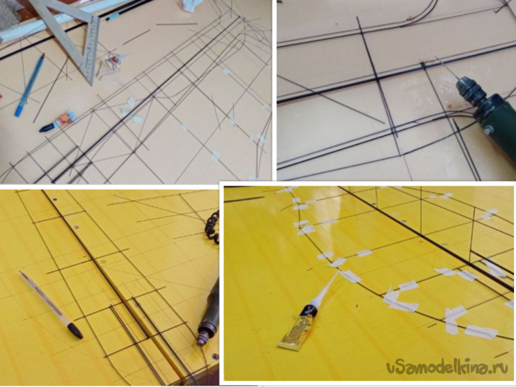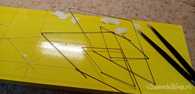 По чертежу изогнул внешний контур фюзеляжа из прутка 0.7 мм. Все внутренние детали из прутка 0.5мм. На стапеле фиксировал малярным скотчем, сгибал при помощи паяльника и склеивал циакрином. Поскольку клей не прилипает к скотчу, отделял конструкцию от стапеля без проблем. Поддевая канцелярским ножом. Склеенную конструкцию укреплял, провязывая узлы соединения прутиков при помощи арамидной нитки и проклеивая вязку циакрином.