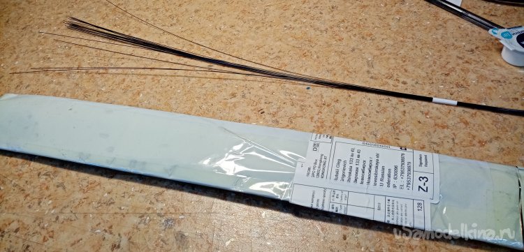 От предыдущего проекта остались некоторые части конструкции. Внимательно изучив и измеряв составляющие, пришел к выводу. Использовать в этом проекте удастся только горизонтальную часть фюзеляжа. Жаль, конечно. Её тоже придется немного модернизировать. Поверх основных прутиков установлю балку, выполненную из круглой трубочки от хлыстика удочки. Тяжеловата деталька, придется немного веса снять. При помощи шкурки и под струёй воды сгоняю вес с трех граммов до 0.78 грамма. В творческом азарте прошкурил три хлыстика сечением диаметров в корне 2.5 миллиметра. Выбрал самый легкий. Его приклеил точно посредине оставшейся горизонтальной части фюзеляжа. Клеил циакрином. Затем в некоторых местах привязал арамидной нитью.