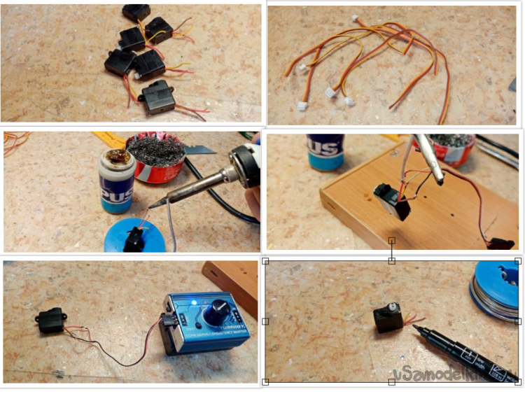 Поскольку у меня максимально легкие сервоприводы, но они от вертолетиков разъемы не подходят к сервотестеру и приемнику. Нужно установить качалки нулевое положение. Поэтому отрезаю провода и временно припаиваю нужные разъемы. При помощи сервотестера устанавливаю все в нулевое положение, отмечаю фломастером.