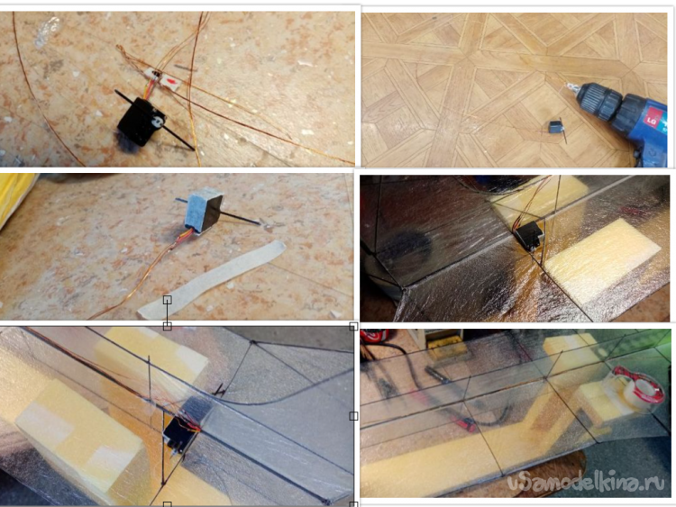 Установив все в нули, просверливаю отверстия в 1 мм и устанавливаю карбоновые прутики, вместо стандартных качалок. Отыграл еще несколько граммов веса. На качалки из прутиков навешиваю тяги управления, на термоусадке фиксируя циакрином. Усаживаю феном, и получаются отличные шарниры. Удлиняю провода управления сервоприводов медным лаковым проводом. Заодно помечаю плюс, минус питания. Устанавливаю на места, предварительно обернув малярным скотчем. Заклеиваю на циакрин. На элероны устанавливаю парочку сервоприводов.