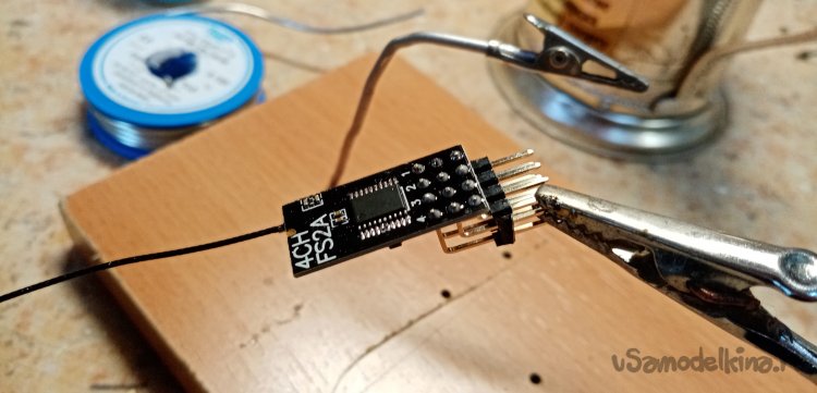 После установки сервоприводов по местам можно начинать укладывать провода питания и управления. Поскольку уже с центром тяжести ясно и места оборудования определены, протягиваю медные эмалевые повода к месту крепления приемника. Обрезаю кончики, и припаиваю разъемы для присоединения . Было большое искушение припаять провода прямо на контакты приемника, но пока нет смысла он т так очень маленького веса. Поэтому припаиваю к плате штекеры.