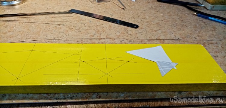 Подготовил старый стапель для работы, оклеил новым скотчем, для защиты от клея. Перенес с пенопластовых плазов нужные чертежи на стапель. Чертил обыкновенной шариковой ручкой. Помарки просто стирал спиртом.